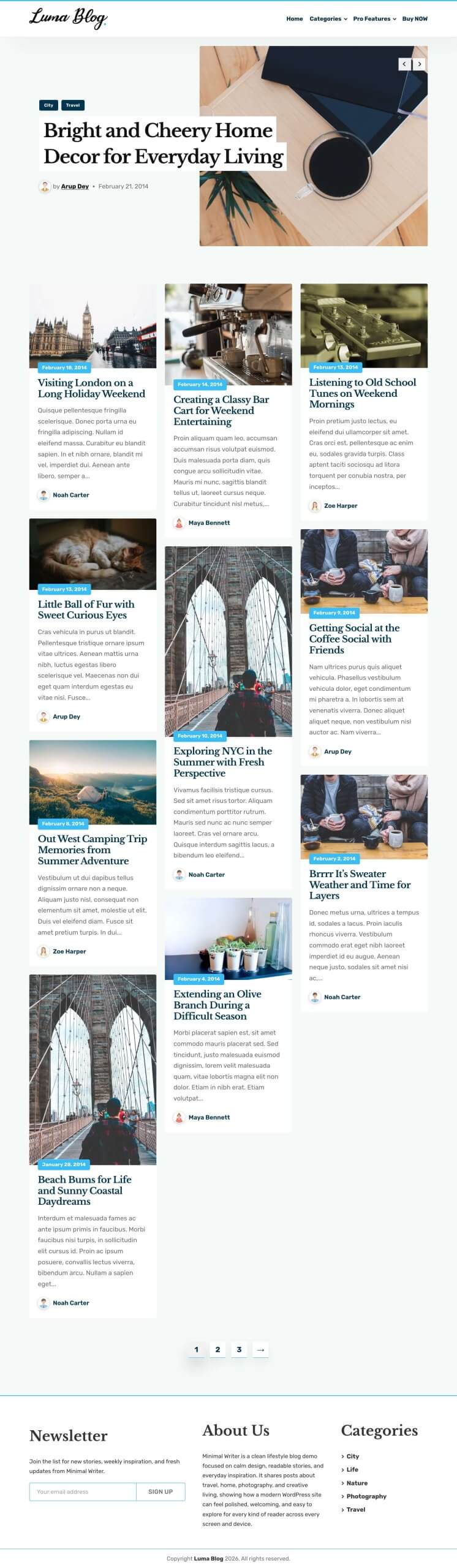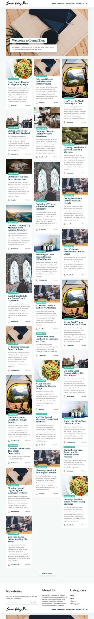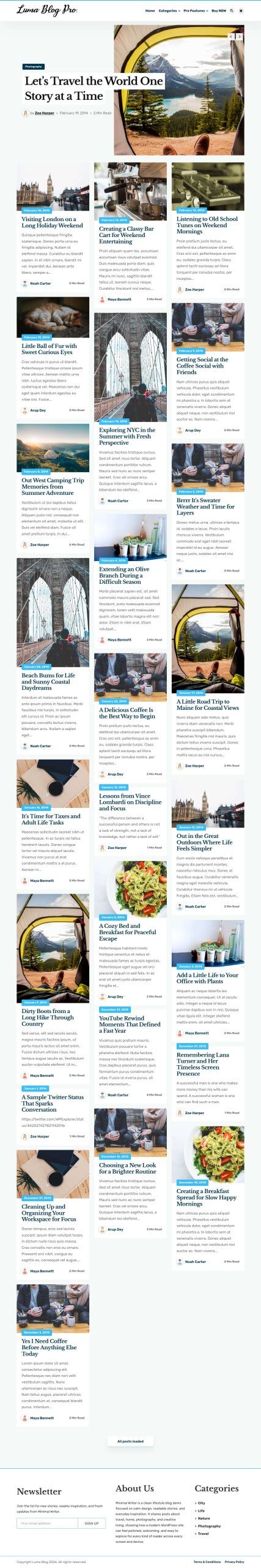 Luma Blog Pro is all you need!! It is a multipurpose blog theme that can be used for all types of blogs for example travel blog, news blog, personal blog etc. The theme option makes it very easy to customize the theme!